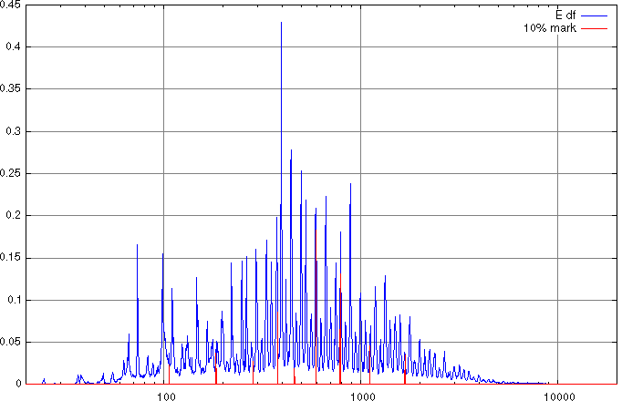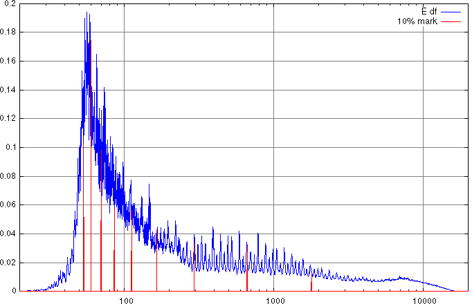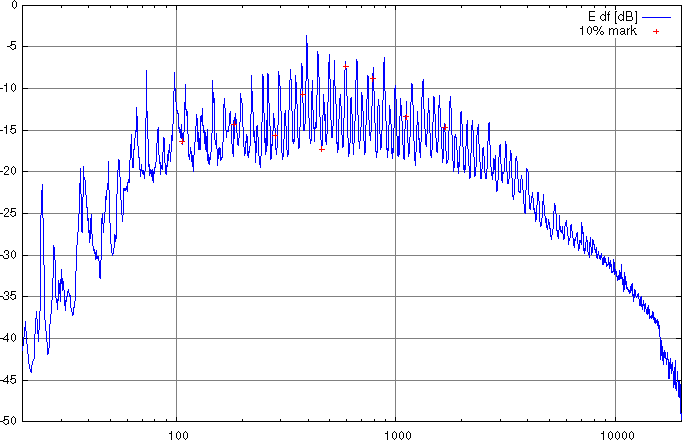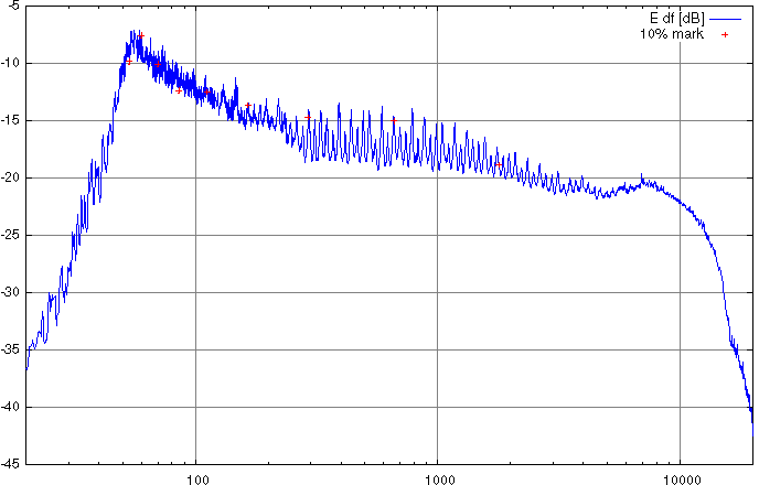 Die folgenden Frequenzspektrum zeigen Energiedichteverteilungen mit logarithmischer Frequenzskala. Dabei wurde auf Flächenerhalt skaliert. Die 10%-Marken teilen das Frequenzspektrum in 10 Bereiche mit jeweils identischer Gesamtenergie.