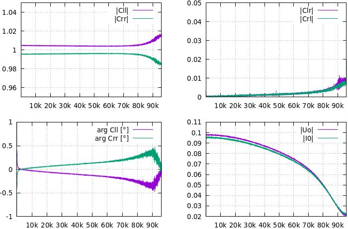 The magnitude of this quotient is a measure of the degree of gain difference between the two channels. A typical value is mainly independent of the frequency and close to but not exactly one. This is due to tolerances in resistors. At low frequencies the difference may increase due to tolerances in the coupling capacitors.