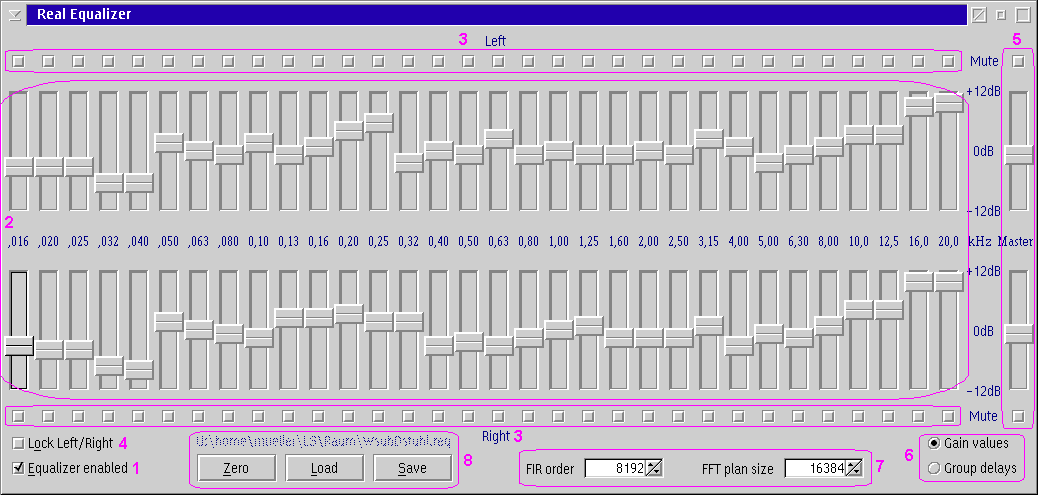 Here you can load and save equalizer setups. The file name above the buttons is the last used file. It is grayed out if the settings are modified since the last load/save.